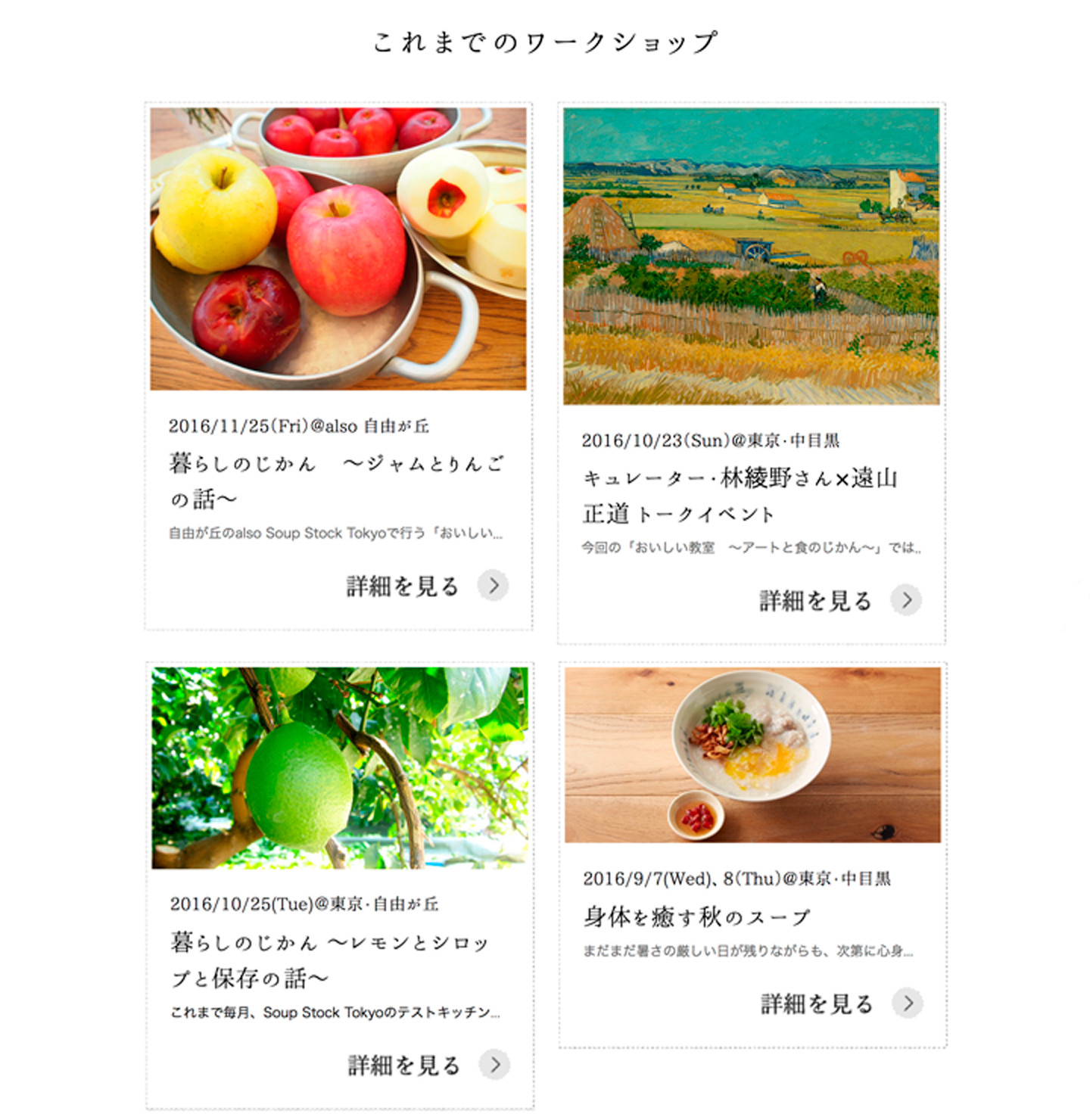 ページはホワイトスペースを広めにとっている分、見る人が、食材や盛り付け、テーブルウェアの写真に集中できます。PCやスマホ越しでもイベントの全体感と雰囲気が伝わり、商品にも興味がわいてくるのではないでしょうか。