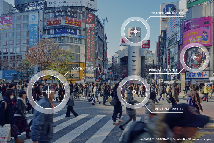 まずは手前に写っている雑踏を行き来する人々。当然ここには肖像権の問題が考えられます。そしてビルの上の看板に掲げられた企業のロゴマーク、これには商標権が。もしビル壁面の大型ディスプレイに有名なタレントやアーティストが写っていれば、パブリシティ権に絡む問題が潜んでいるかもしれません。