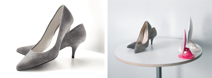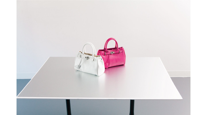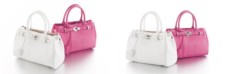 まず、商品撮影で大切なのは、被写体とカメラの距離です。左は被写体から離れて撮影したもの。2つの商品がほぼ同じ大きさで並んでいて優劣はありません。これに対して右は、ぐっと商品に近づいて撮影したもの。手前に置いた白いバッグが大きく強調されています。写真を撮る距離によって、これだけ存在感のちがいが現れます。説明的に撮りたい時は遠い距離から、一部を強調したい時は近い距離から撮ることを心がけましょう。