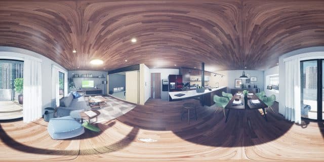 住宅のインテリアをVRで見るための360度画像をレンダリングしたイメージは、このようなものとなり、ライティングによってリアルさが付加されていることがわかる。ちなみに、このままでは歪んでいるが、VRの場合には、これを球体の内部に貼り付けて中心から見回すような状態となるので、歪みは解消される。