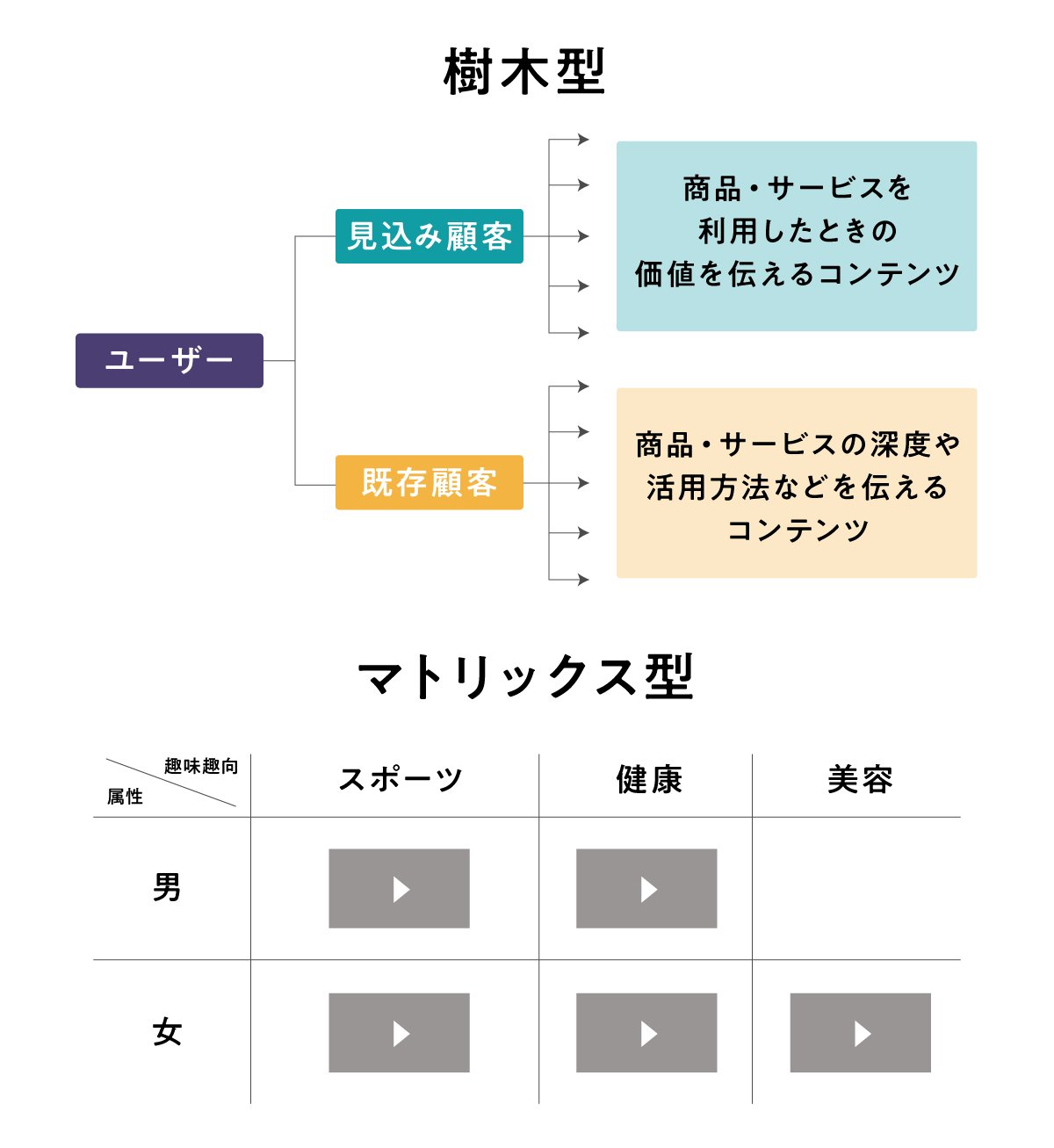 まず、樹木型は誰に何を伝えたいかを明確にできるので、伝えたいことが多岐にわたる時に有効です。たとえば、図のように、見込み顧客と既存顧客などに分け、さらにそれぞれの顧客に向けて何を伝えるかを細分化していきます。