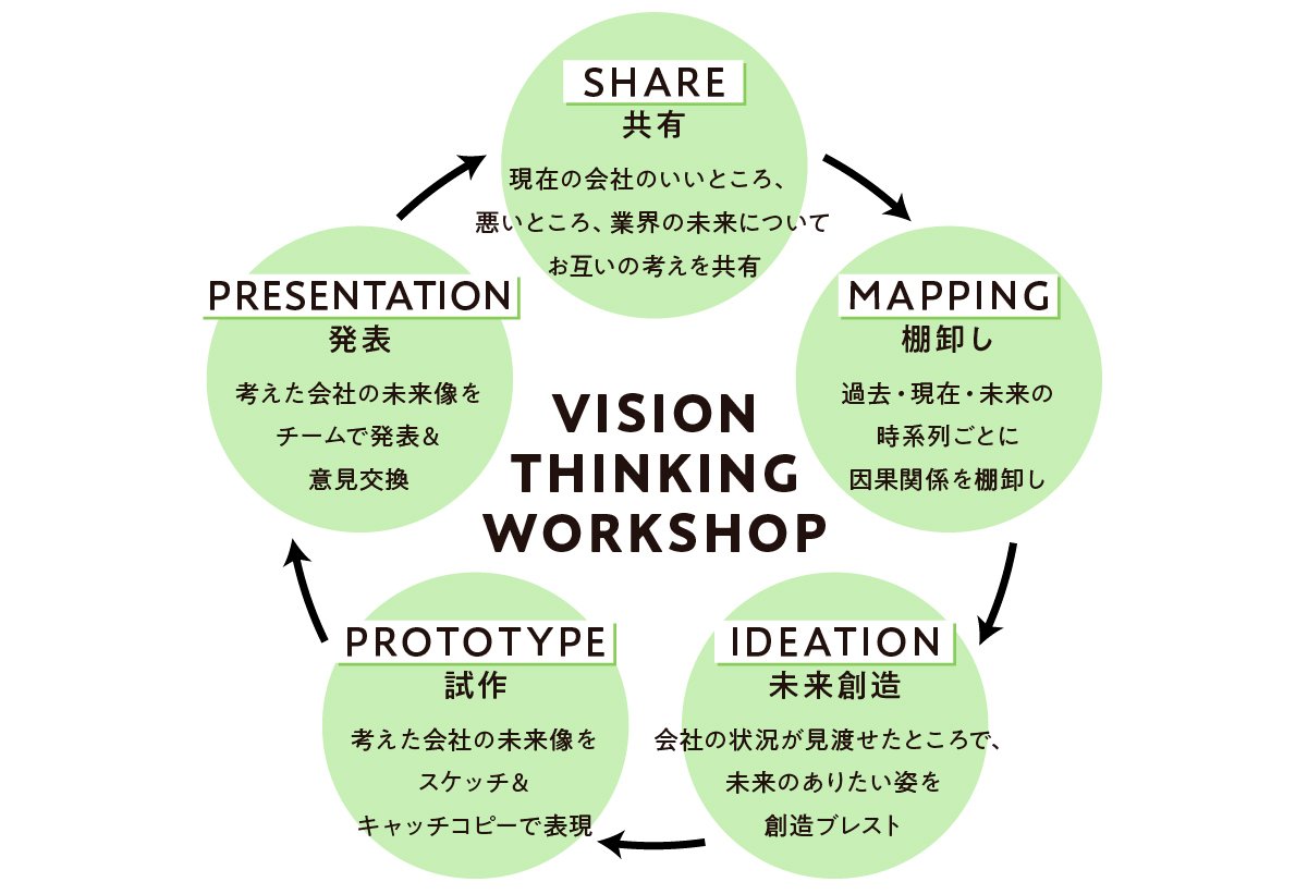 ワークショップの形は、目的や参加者の属性によってさまざまありますが、今回は、企業の課題を棚卸しながら、未来像を導き出すためのワークショップを紹介します。デザインシンキングをベースにして開発した「ビジョンシンキングワークショップ」は、短時間でできるワークショップです。
