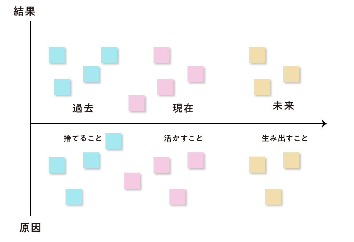 6名程でグループをつくり、付箋に書き出した内容を過去・現在・未来の時間軸に沿って因果関係を整理。時系列を書いた紙を用意し、原因を下半分、結果を上半分に張り出していきます。このとき、因果関係で不足している部分は付箋を付け足していきます。
