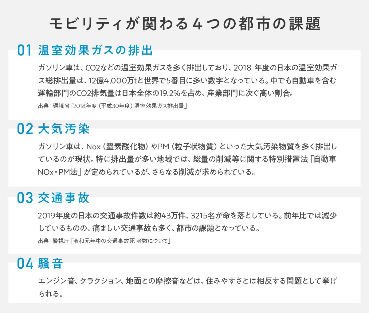 今回、amana mobilityと森さんが挙げた、モビリティが大きく関わる都市の課題は大きく4つ。