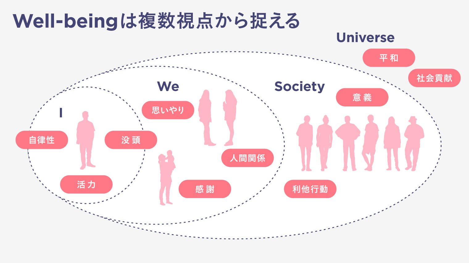 渡邊:ウェルビーイングの主語を、個人としての「わたし」だけではなく、「わたしたち」まで含めたものにすることです。「わたし」という視点からのウェルビーイングだけでなく「わたしたち」の視点からのウェルビーイングをとらえることが可能であり、さらには、大きな不特定多数のコミュニティ「Society(社会)」からのウェルビーイング、世界全体を主語にした「Universe」という視点もあるでしょう。