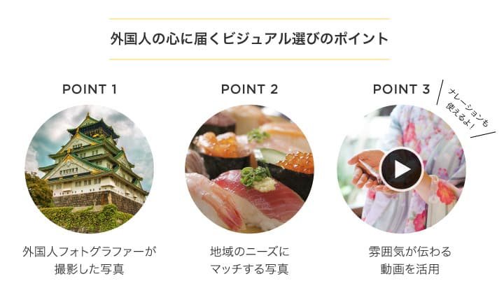 外国人観光客の心を動かすためには、これら違いを意識し、ビジュアルを使い分けることも大切です。