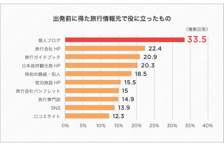 次に、少し視点を変えて……夜の繁華街や東京の下町エリアといったディープな日本を見せる、という選択肢も。ネットやSNSで格段に情報が手に入りやすくなった今、観光庁のリサーチでも下記図のとおり、外国人観光客が出発前に参考にするもののトップは「個人のブログ」。他にも様々な媒体から情報を集めており、これまでなかなか海外に紹介されてこなかった場所にも興味を持ってもらえる可能性が広がっています。