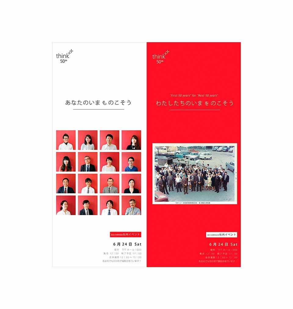 黒田:アマナからのアドバイスを受けて、イベントを開催する半年前から、先の50年前に撮った全員写真などを使って社内用の告知ポスターを制作して、社内に貼りまくりました。「わたしたちのいまをのこそう あなたのいまをのこそう」というキャッチフレーズもつくり、社内で作成したニュースペーパーも複数回発行しました。