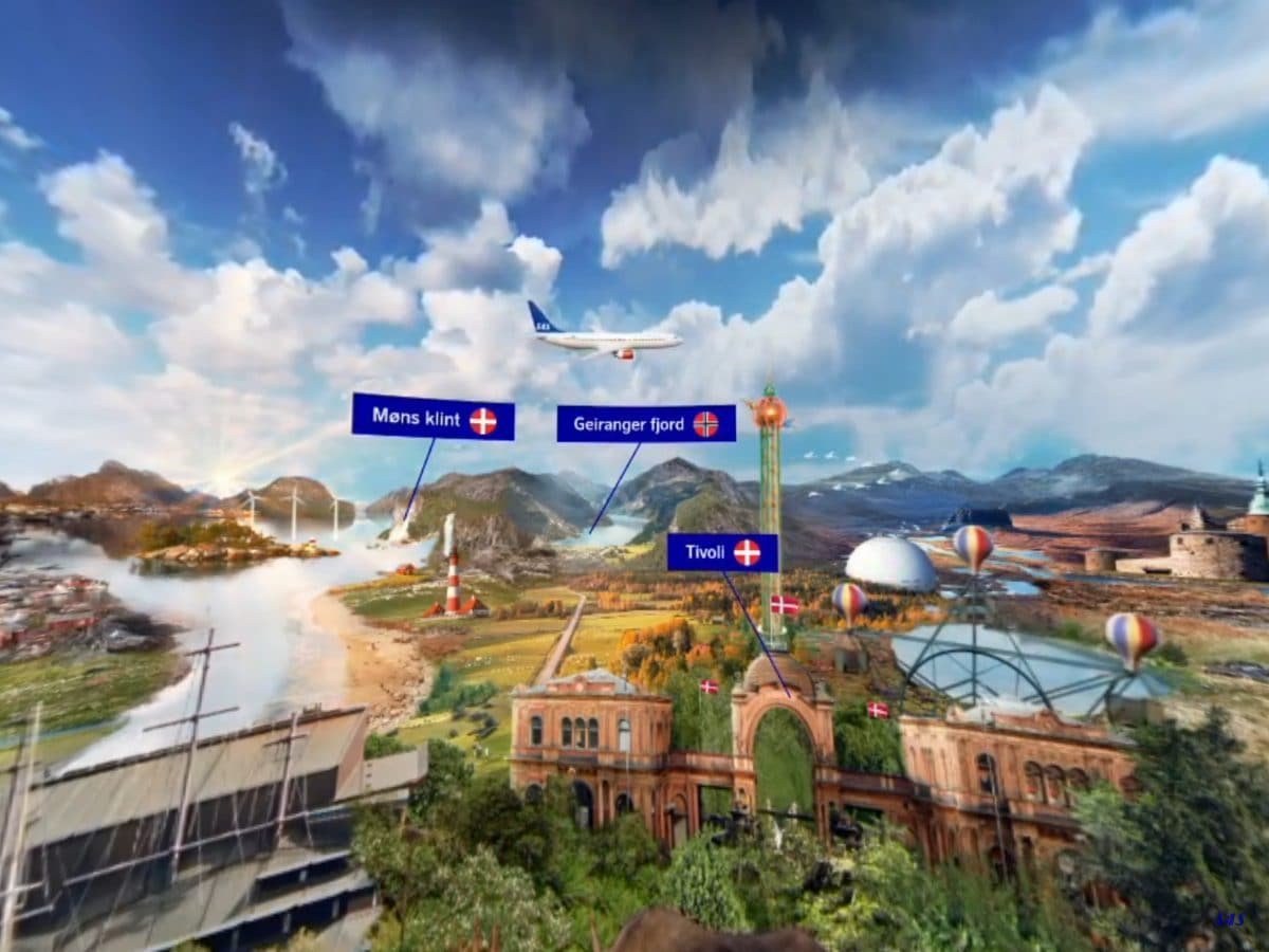 旅客機の飛んでいくほうに見る向きを変えていくと、パノラマの上に見どころの名称と国のシンボルが現れる。左から、ムンスクリントはデンマークの美しい崖。ガイランゲルフィヨルドはノルウェーの世界最大級の氷河侵食湾。チボリはデンマークのコペンハーゲンにある遊園地だ。