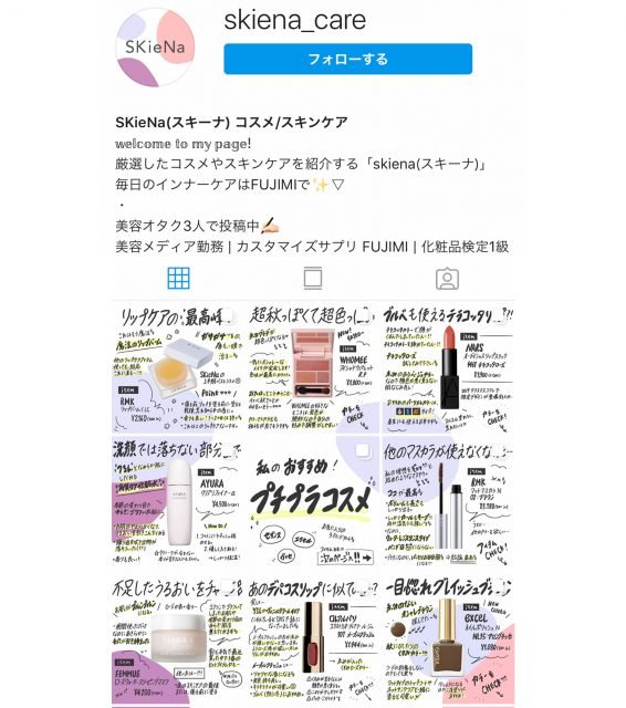 コスメやスキンケア用品を紹介するアカウントで、コスメアイテムの切り抜きとともに、テキストを載せています。写真1枚に言いたいことを集約。手書き文字や絵文字を用いることで口コミ感も演出しています。それでいて見出しとなる大きめの文字と小さめのテキスト文字、マーカーを使うなどメリハリがあり、読みやすく工夫されています。