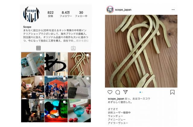 ネット専用のインテリアショップ「Scope」のアカウントは、クスッとしてしまうユニークな文章が特徴的。まるで友人と話しているような軽やかな文章からは、店主の人柄が伝わってきて親近感を覚えます。買い付け中の様子や感想など、商品紹介以外の投稿も多数。エッセイを読んでいるような面白さがあり、直接商品を紹介していなくても、ショップに興味を持ってもらえるきっかけになりそうです。