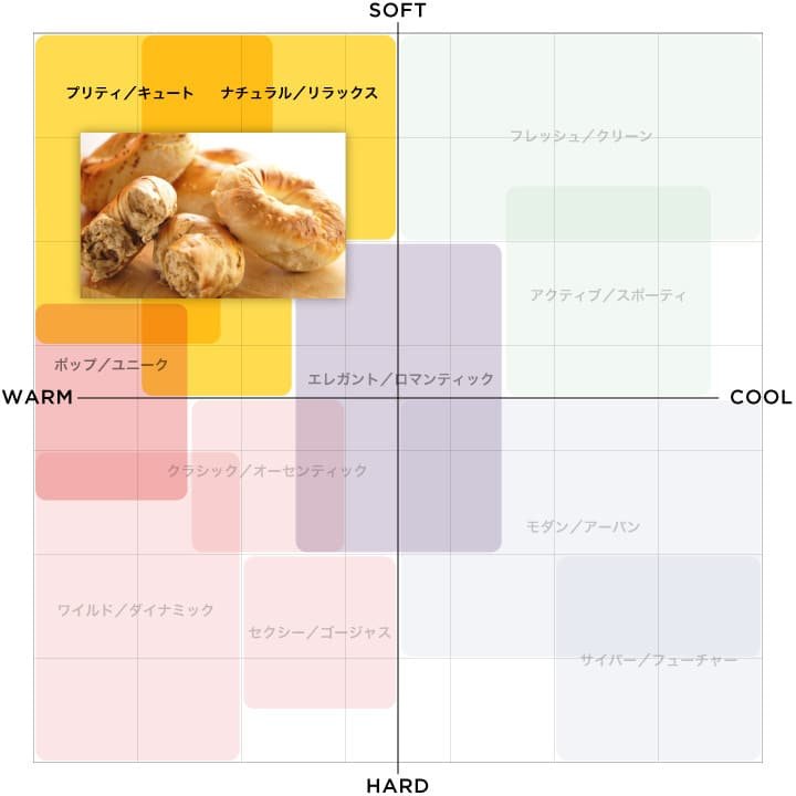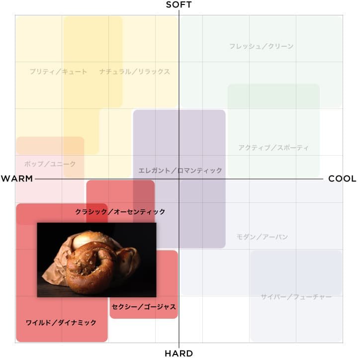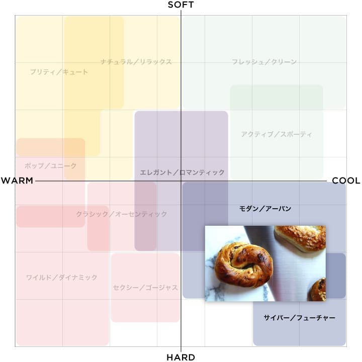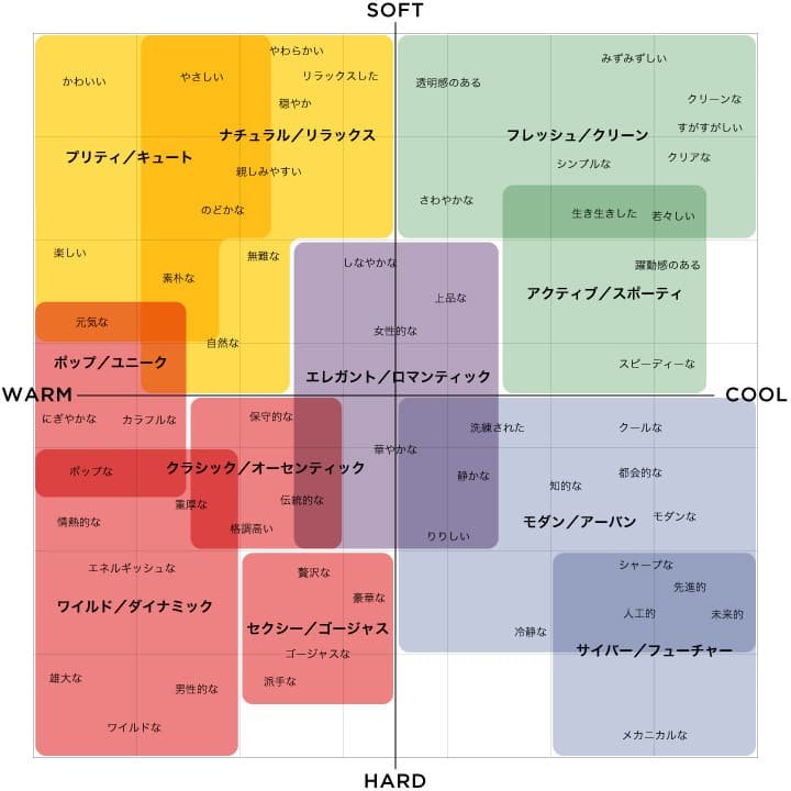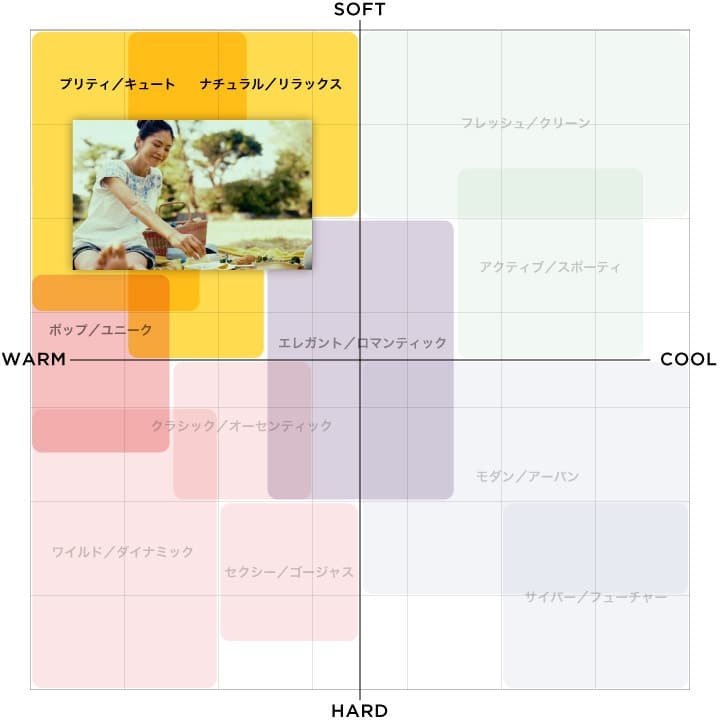 「エモーショナルスケール」とは、以下の図のように、「Cool&Warm」「Soft&Hard」の2軸のマトリックスによって写真を11のテイストに分類し、感性的なイメージを見える化する手法のことを言います。