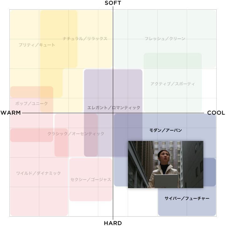 例えば、前述の「都会的で先鋭的な30代の女性」は、洗練されていて、知的でシャープなイメージがありますので、エモーショナルスケールに当てはめてみると、右下の「モダン/アーバン」、「りりしい」といったゾーンにマッピングできます。