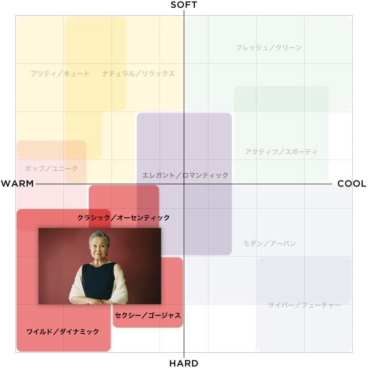 「品の良いプレミアム世代の女性」では、格式高いクラシックなイメージですので、左下のゾーンに当てはまります。