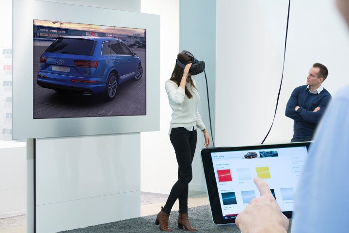 続いては、今年1月にラスベガスで開催された「CES 2016」で話題を呼んだ、自動車メーカーAUDIによるHTC Viveを使ったVRショールームです。2つのモードが用意されていて、ひとつはHMDを装着したユーザーがタッチスクリーンの操作で車種やカラーを選び、運転席に座ってインテリアやパーツを確認することができるというものです。