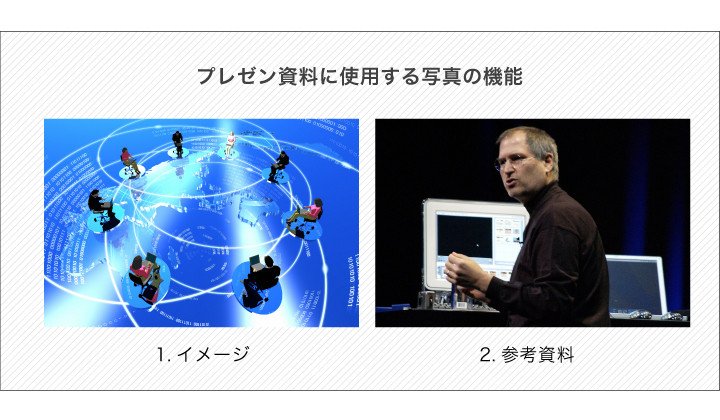 そこで、リスクを最小限に抑えながらネット上の画像を上手に活用する方法はないか、プレゼン資料に使用する写真を機能別に大きく二つに分けて考えてみました。