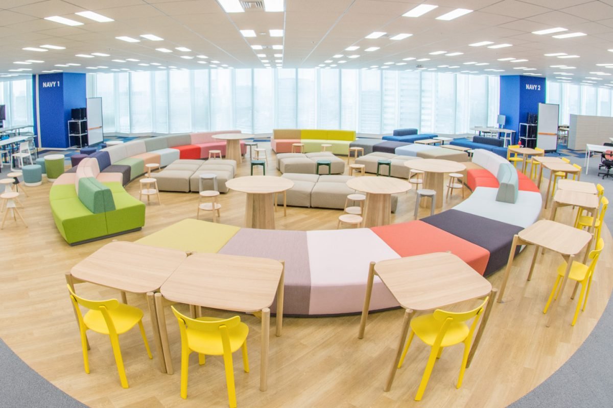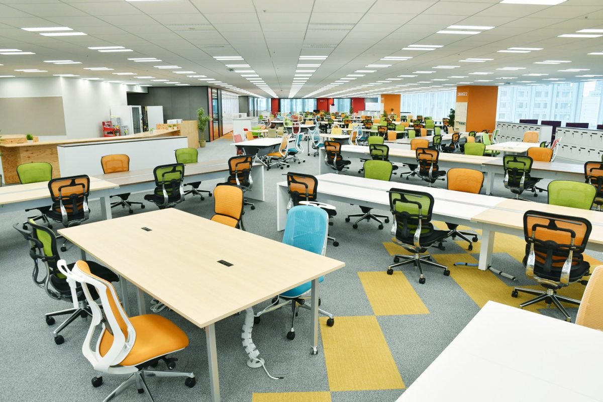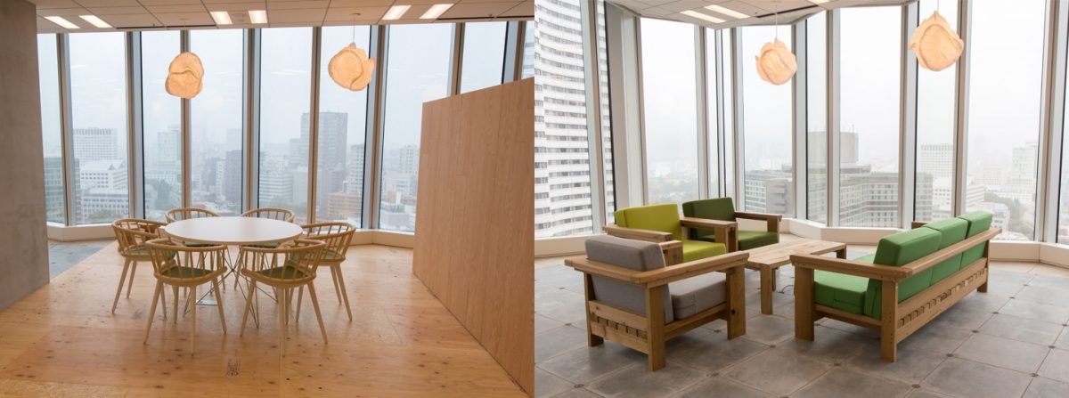 20階の一部は社員用の共有スペース。このフロアも、作業やミーティングが自由に行われるように、デスクや椅子をあえて直線ではない並べ方にしています。