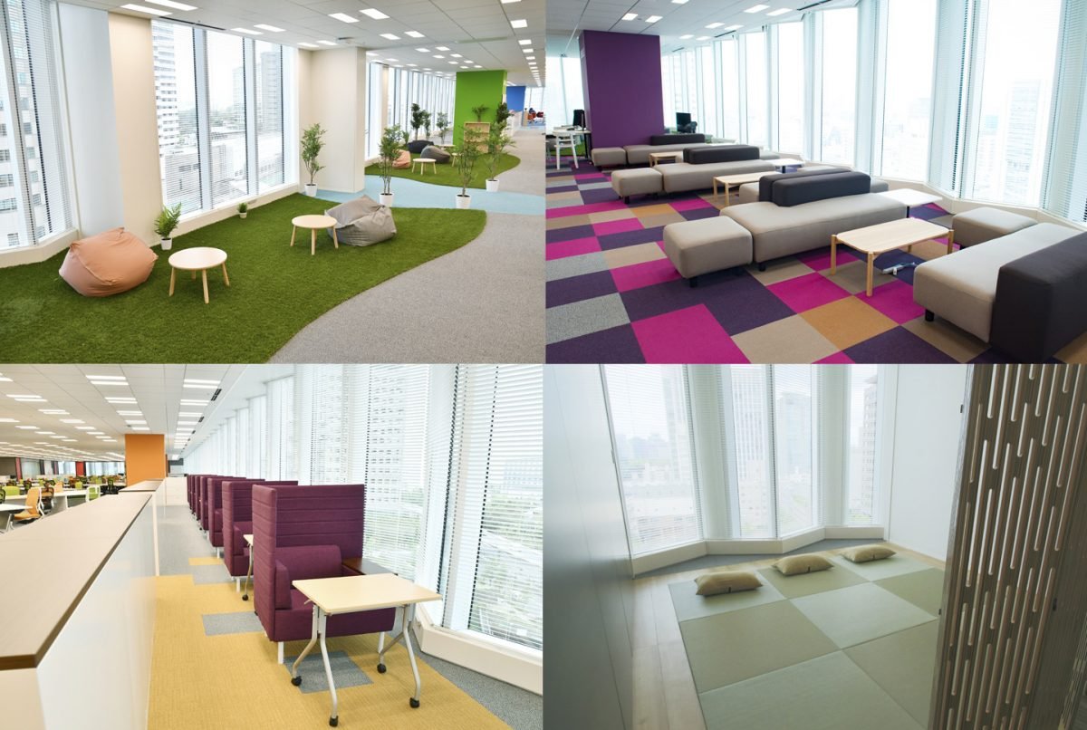 畳や芝生スペースなどもあり、靴を脱いで芝生でくつろぎながら仕事をしてもOK。集中して仕事をしたい人用に、個室風に仕切られたブースもあります。