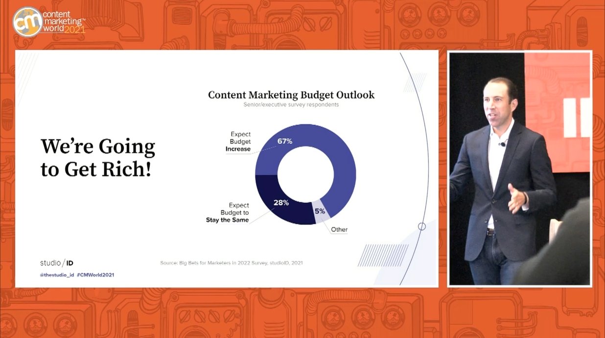 studioIDの調査によれば、アメリカ企業の上級幹部を対象にしたアンケート結果において、その67%が2022年にはコンテンツマーケティングのための予算を増やしていくと回答している。マキュー氏はこれを「我々(コンテンツマーケター)は金持ちになれる」と冗談めかして表現したが、給与には直接影響しないまでも、来年以降、コンテンツマーケティング施策が拡大していくことは間違いない。