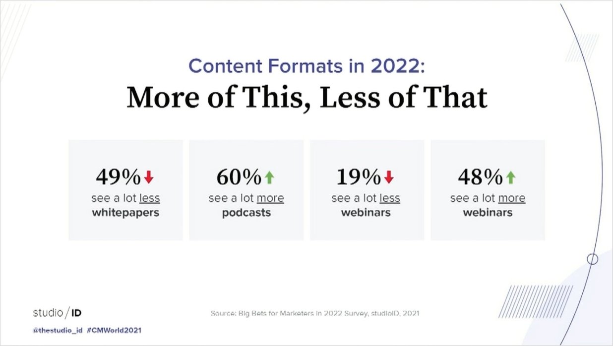 そこで、2022年にはどのようなコンテンツ形式に力を入れるべきかという点だが、studioIDの調査結果によれば、マーケターの約半分がホワイトペーパーから遠ざかり始めており、6割がポッドキャストの増加を予想している。これは、レポートの後編記事でも触れる「紙の時代の情報の見せ方からの完全なる脱却」により、成熟するデジタル時代に即した情報提供のあり方に移行しつつある兆しと考えられる。先に公開された記事内でも、ポッドキャストの重要さに比べて採用する企業が日本では少ないことに触れたが、もしまだ自社で取り組んでいないようならば、2022年はそれを始めるのに、ちょうど良いタイミングといえそうだ。