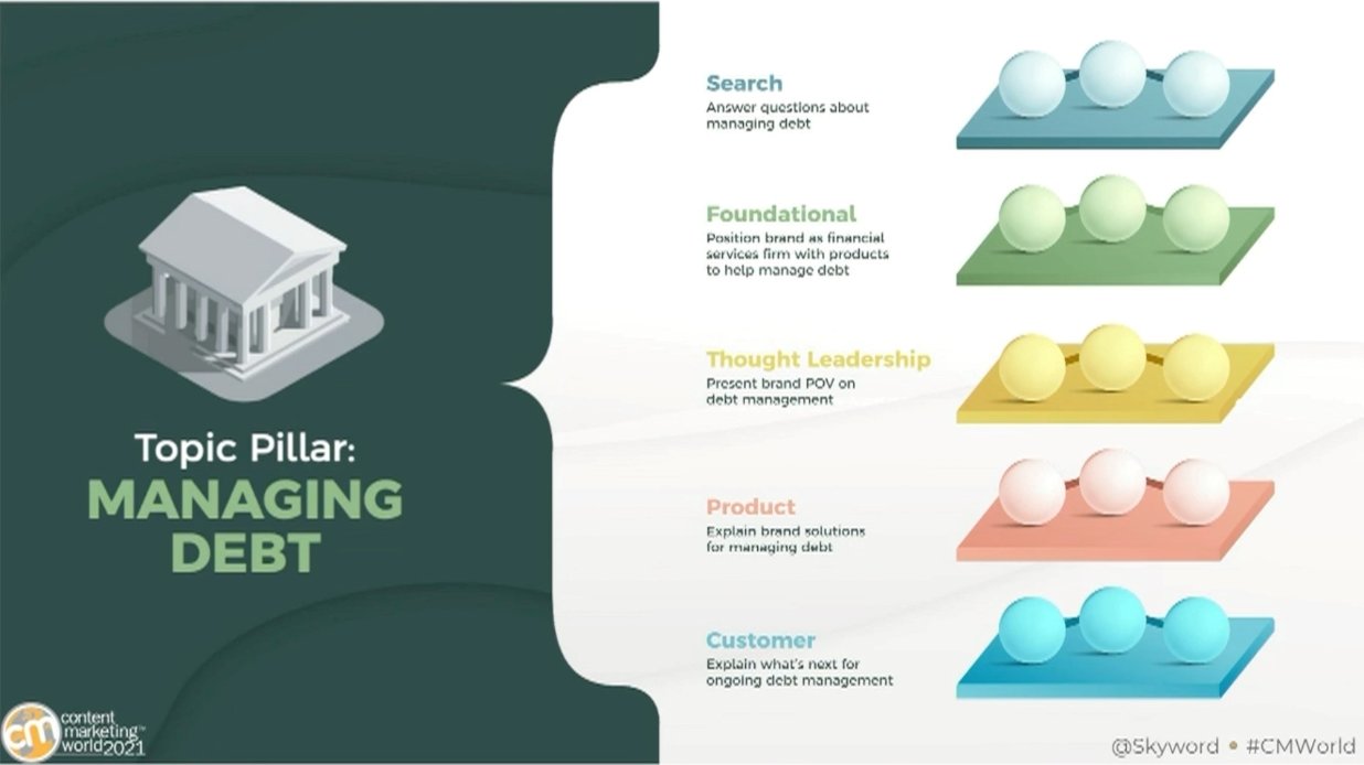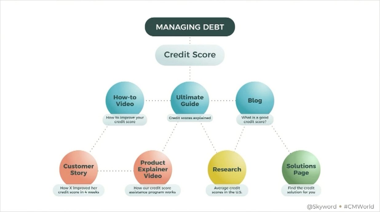 例えば、債務管理問題に対する解決策を探している見込み顧客を想定した場合の「コンテンツ・エコシステム・モデル」。自社が債務問題に関して顧客に有用な情報を提供しうることを、サーチ、ファウンデーショナル、ソート・リーダーシップ、プロダクト、カスタマー、それぞれの切り口でバランスよく印象付けていく。