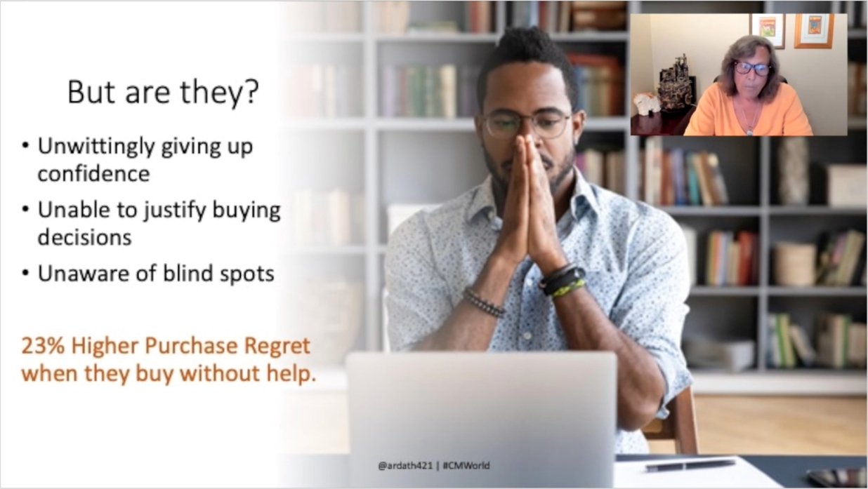 アルビー氏は、「BtoB企業の顧客は、そうした調達をコントロールできていると考えているが、本当にそうだろうか?」と疑問を提起。自分たちの力だけで資材調達などを図る顧客企業は、情報の正確さに自信が持てず、購買の判断を正当化する手段がなく、盲点に気づきにくいとし、その23%が適正価格で購入できなかったことを悔やんでいると指摘した。