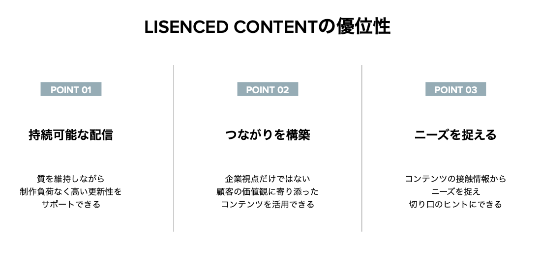 そんな中で、ライセンスドコンテンツを活用して質と量を保ちながら精度を上げていき、オーディエンスにリーチする仕組み作りをする『コンテンツマーケティング』という手法をアマナから提案されたといいます。