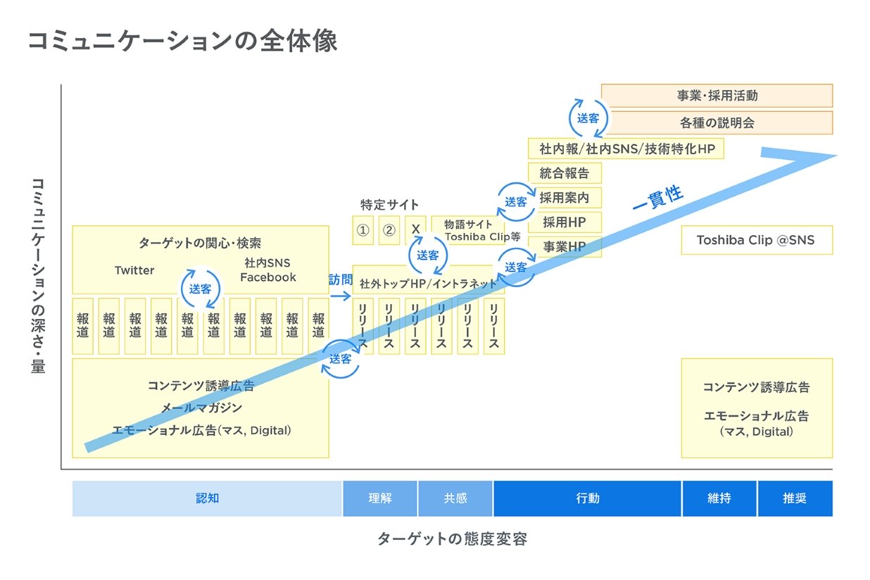 ブランドコミュニケーション室が考えるコミュニケーションマップ。横軸がターゲットのステータス(エンゲージメントレベル)、縦軸がコミュニケーションの深さや量を示す。東芝ブランドの「認知」段階にあたるアテンションレベルのマスメディア広告などでは語られない、より深いレベルの理解や共感を得るためのコンテンツ発信を担うのが、オウンドメディアであるToshiba Clipの役割。