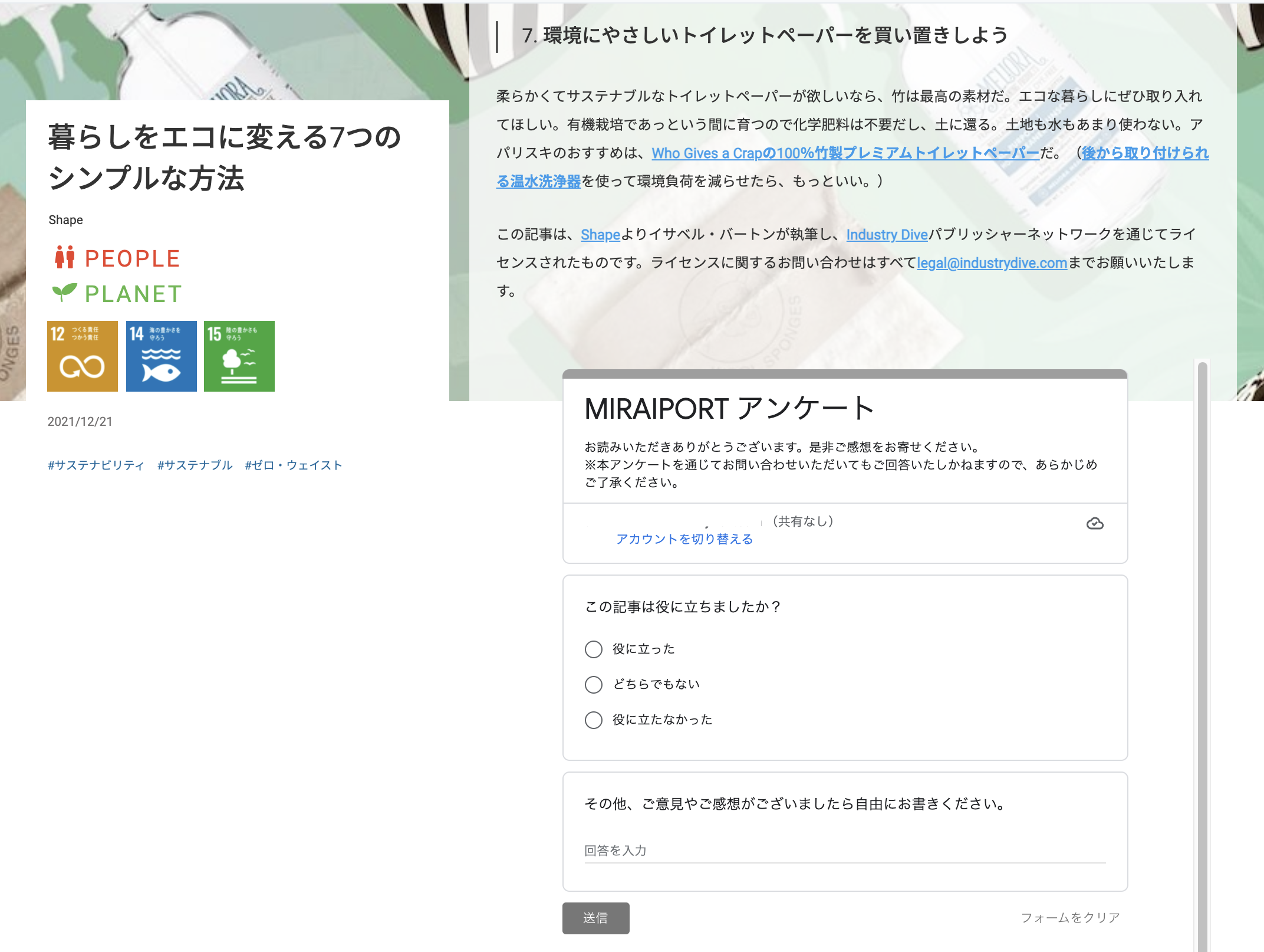 「その時に私たちが懸念していたのは、単に企業としてSDGsへの取り組みを発信するだけではメディアが提供する情報量として適切なものにならないのではないかということでした。アマナさんからのご提案で私たちが魅力を感じたのは、オウンドメディアでさまざまな記事に一般の方が接する中で、弊社の取り組みを紹介する記事にも興味をもっていただく仕組みでした」(戸室さん)