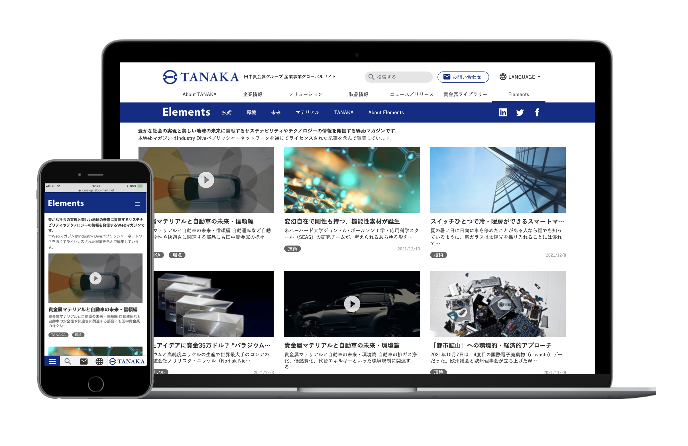 TANAKA HDが運営するオウンドメディア「Elements」。貴金属に関するさまざまなコンテンツを掲載している。